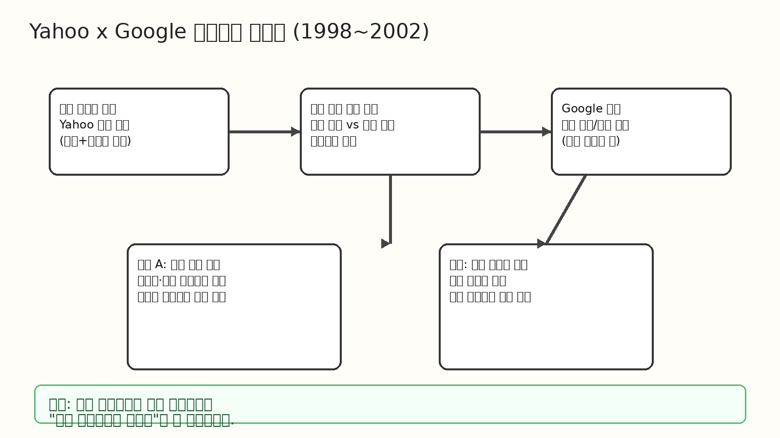 왜: 당시 Yahoo의 수익 논리는 “콘텐츠·메일·뉴스 안에 사용자를 오래 머물게 하는 것”이었고, 검색은 그 체류를 보조하는 도구로 취급되기 쉬웠기 때문이다.